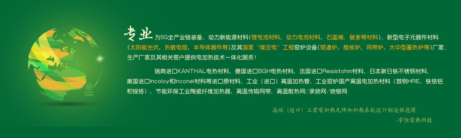 ??????公司專業(yè)生產(chǎn)各種精密電熱(電阻)合金、負(fù)載合金、各種電子陶瓷熱處理電熱元件、工業(yè)窯爐網(wǎng)帶及工業(yè)電加熱管。并代理和銷售瑞典進(jìn)口康泰爾電熱合金材料,日本新日鐵進(jìn)口不銹鋼材料,美國進(jìn)口Incoloy和Inconel材料等進(jìn)口合金產(chǎn)品。產(chǎn)品被運(yùn)用在5G產(chǎn)業(yè)鏈裝備、鋰電池正負(fù)極材料行業(yè)、"煤改電"行業(yè)、碳纖維行業(yè)、陶瓷電子專用設(shè)備、粉體材料、海綿鈦和釩鈦產(chǎn)業(yè)等領(lǐng)域。[詳情見宇恒產(chǎn)品]